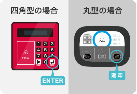四角型:STARTボタン押下時に緑のランプが点滅し、「カード/コード」の表示が出ること